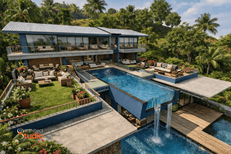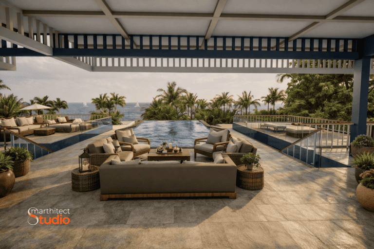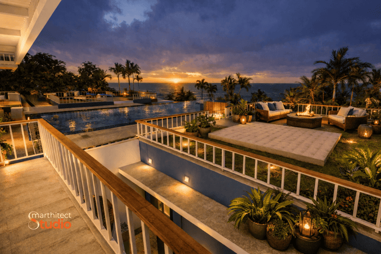 The scale and intricacy of the design posed challenges in terms of adhering to local building regulations, which limit the size of buildings near the beach. To resolve this, I implemented an innovative solution: we designed four separate structures connected by terraces, with the two pools centrally positioned between them. This approach allowed us to meet regulatory requirements while creating a cohesive and functional layout. The roof was divided into two parts and linked by a glass roof over the stairwell, contributing to a visually appealing design.