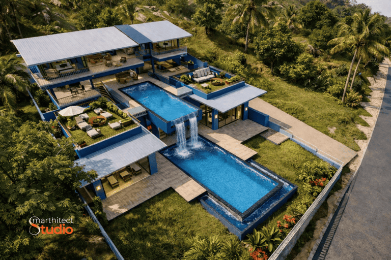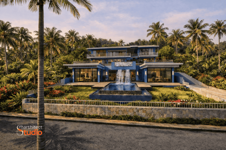 Located on the tranquil shores of Koh Yao Noi, this exquisite three-story villa masterfully combines modern design with stunning ocean views. The upper floor features a private living area with two bedrooms and expansive terraces, while the middle level boasts a long swimming pool and open-plan spaces. The lower floor offers versatile rental apartments and a second pool with a cascading waterfall. Designed to meet local regulations, the villa comprises four interconnected structures, with interiors showcasing a tropical palette of blues and grays, using durable materials. The result is an elegant, inviting sanctuary that delights the client.